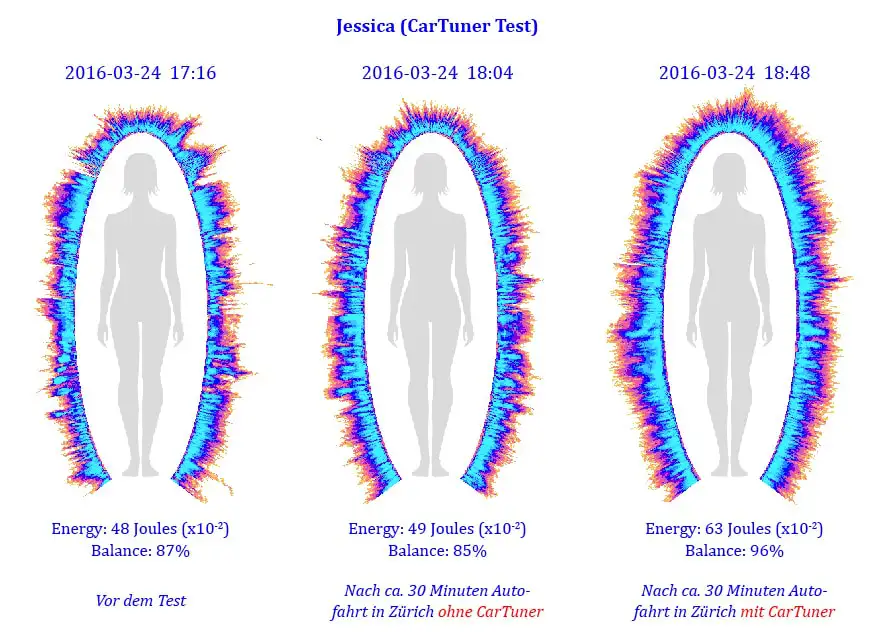 Nach der zweiten Fahrt mit dem CarTuner sind die Unterschiede offensichtlich: Jessicas Energie ist von 49 auf 63 Joules gestiegen und ihre allgemeine Balance hat sich um 11% auf 96% erhöht.