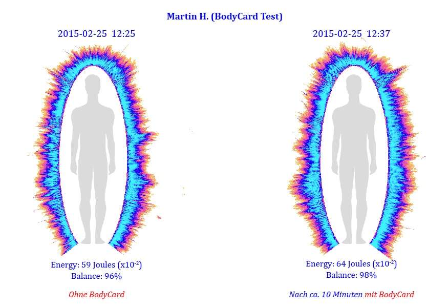 Sehen Sie hier, welchen Wirkung das Tragen der BodyCard nach nur 10 Minuten auf das Energiefeld von Martin H. (ca. 35 Jahre alt) aus Basel hat.