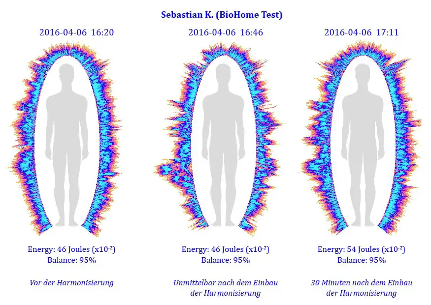 Sebastian hat bereits eine gute allgemeine Balance, jedoch ist sein Energiefeld im Vergleich überraschend schwach. Unmittelbar nach der Installation unserer Produkte zeigt die Messung mit 46 Joules und 95% Balance nicht den geringsten Unterschied. Lediglich die grafische Darstellung hebt sich von der ersten Grafik deutlich ab. Ein deutlicher Hinweis auf energetische Umwälzungen.